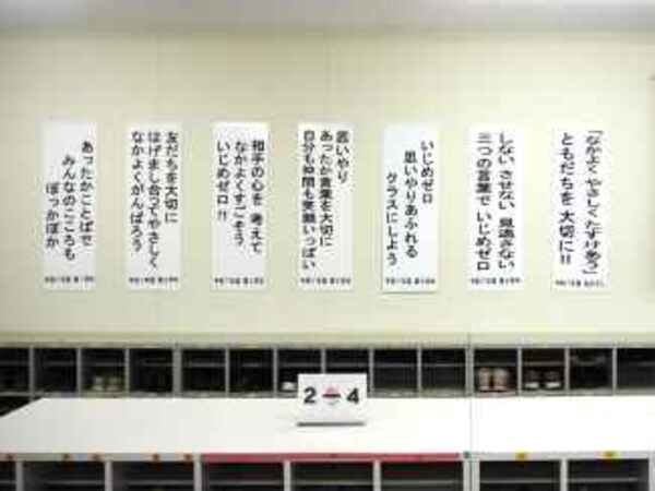今年度、本校の子どもたちが考えてくれたいじめ撲滅スローガンが、育成会の方々の御協力によって、横断幕(児童会スローガン)や看板(学年別)になりました。